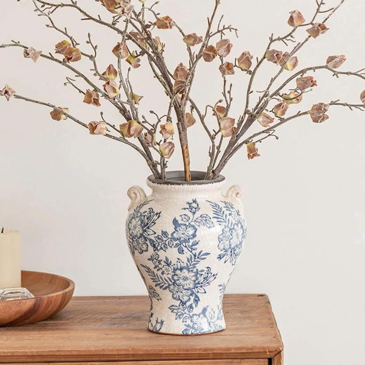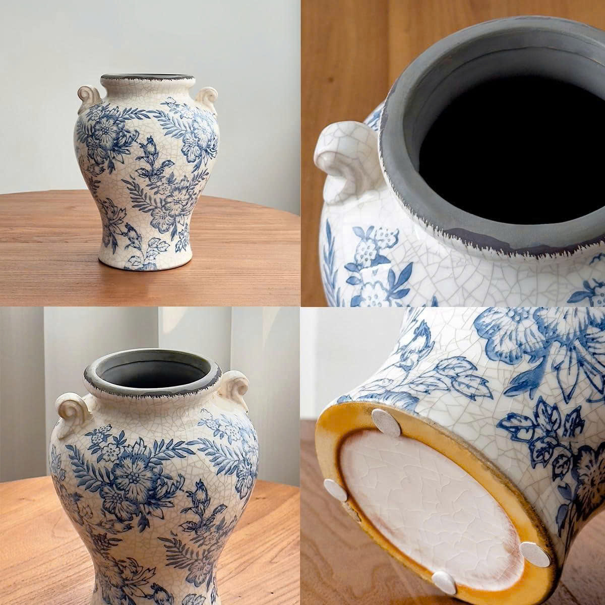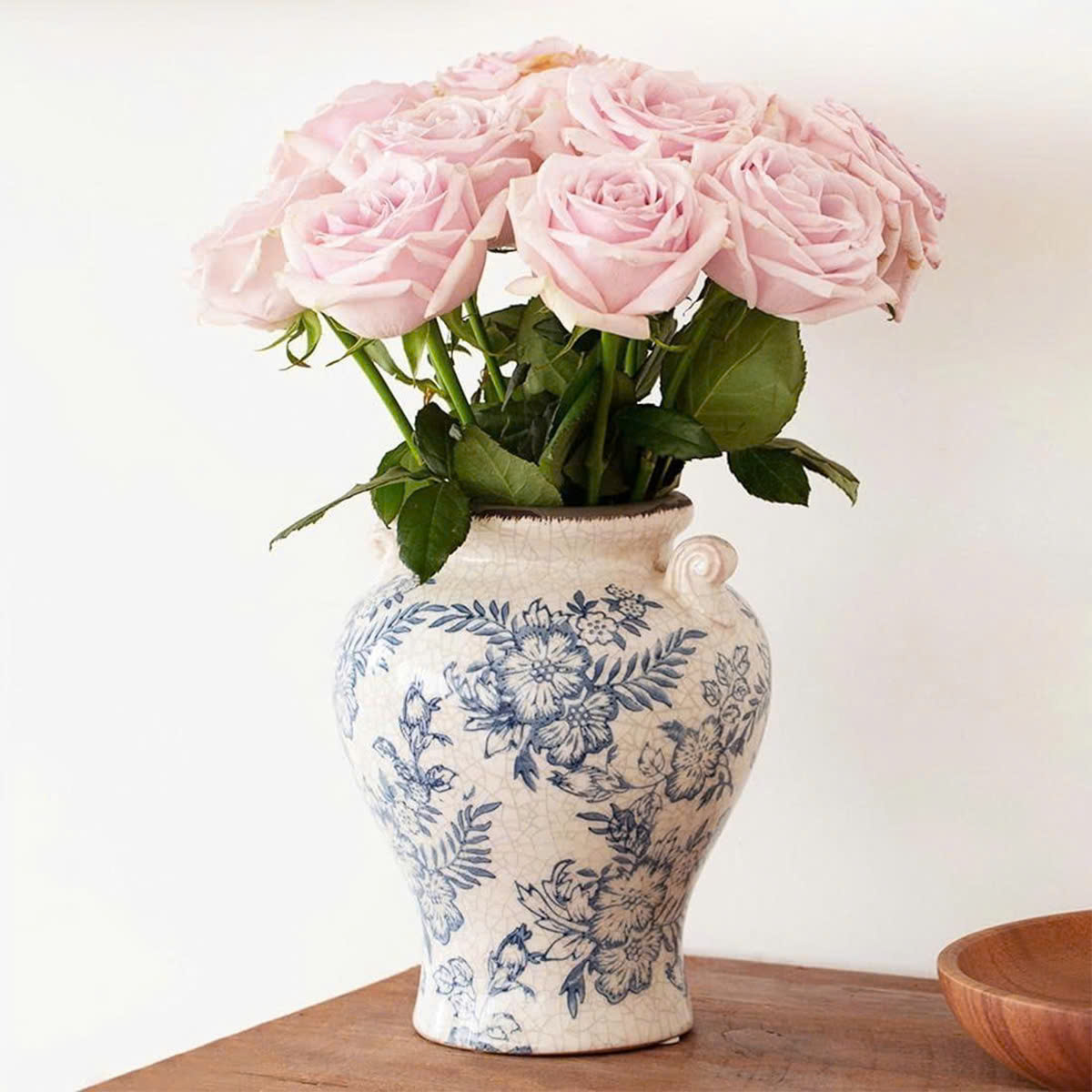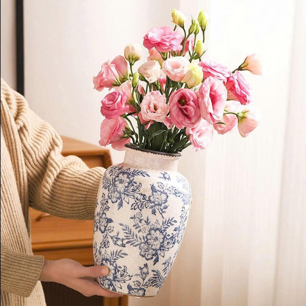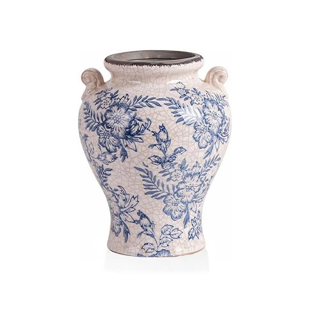 Sắc lam dịu dàng trên nền gốm trắng mang hơi thở cổ điển châu Âu, vừa tinh tế vừa sang trọng. Từng họa tiết được vẽ mềm mại, hài hòa, giúp chiếc bình trở thành điểm nhấn trang nhã cho mọi không gian – từ phòng khách, bàn ăn đến góc console hay kệ trang trí.