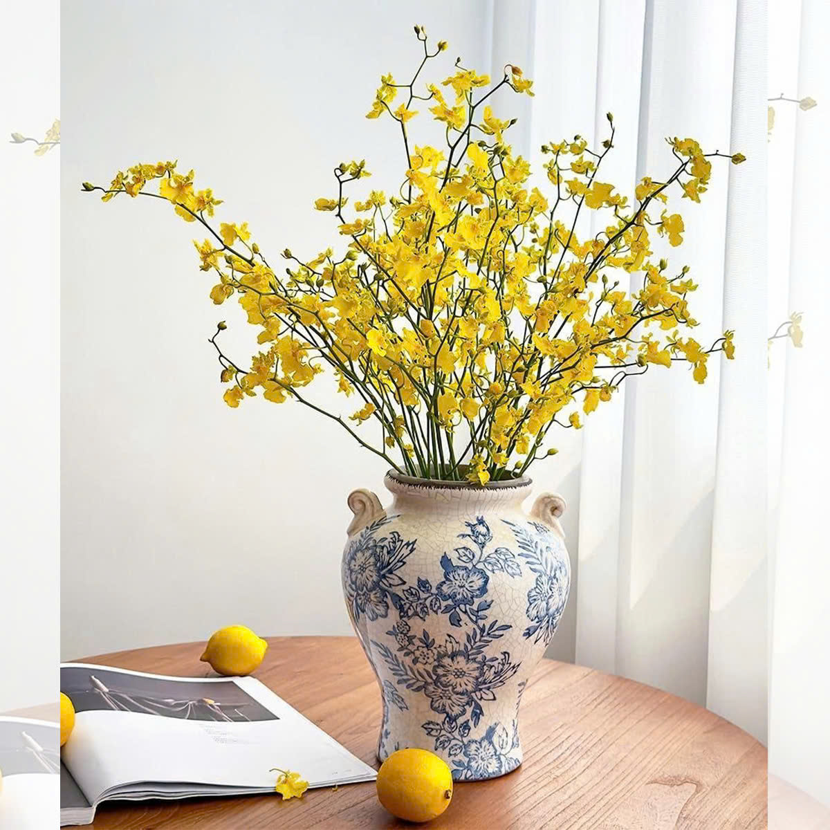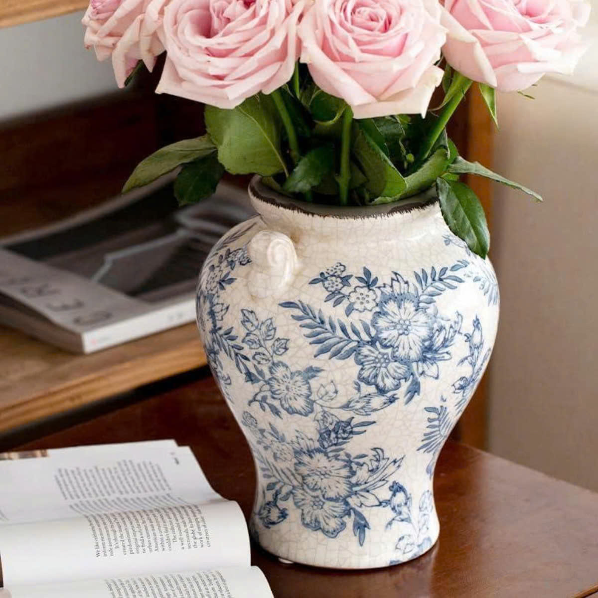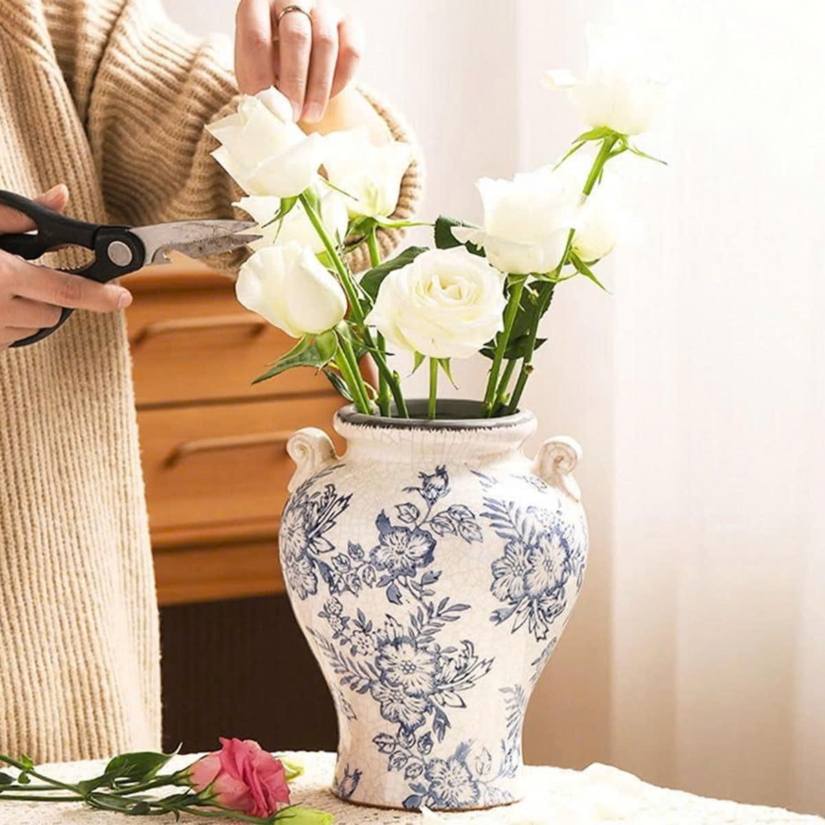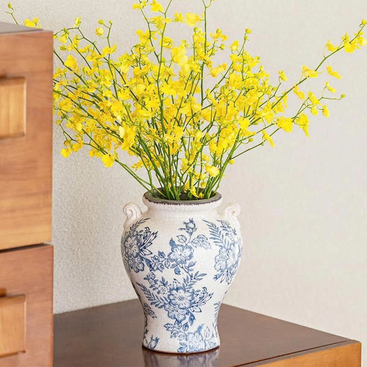 Sắc lam dịu dàng trên nền gốm trắng mang hơi thở cổ điển châu Âu, vừa tinh tế vừa sang trọng. Từng họa tiết được vẽ mềm mại, hài hòa, giúp chiếc bình trở thành điểm nhấn trang nhã cho mọi không gian – từ phòng khách, bàn ăn đến góc console hay kệ trang trí.