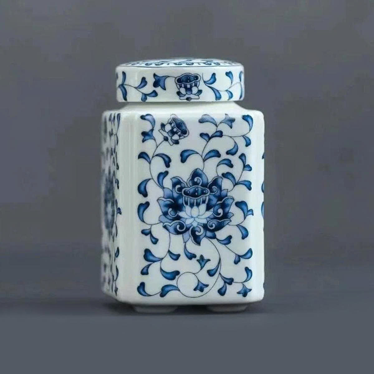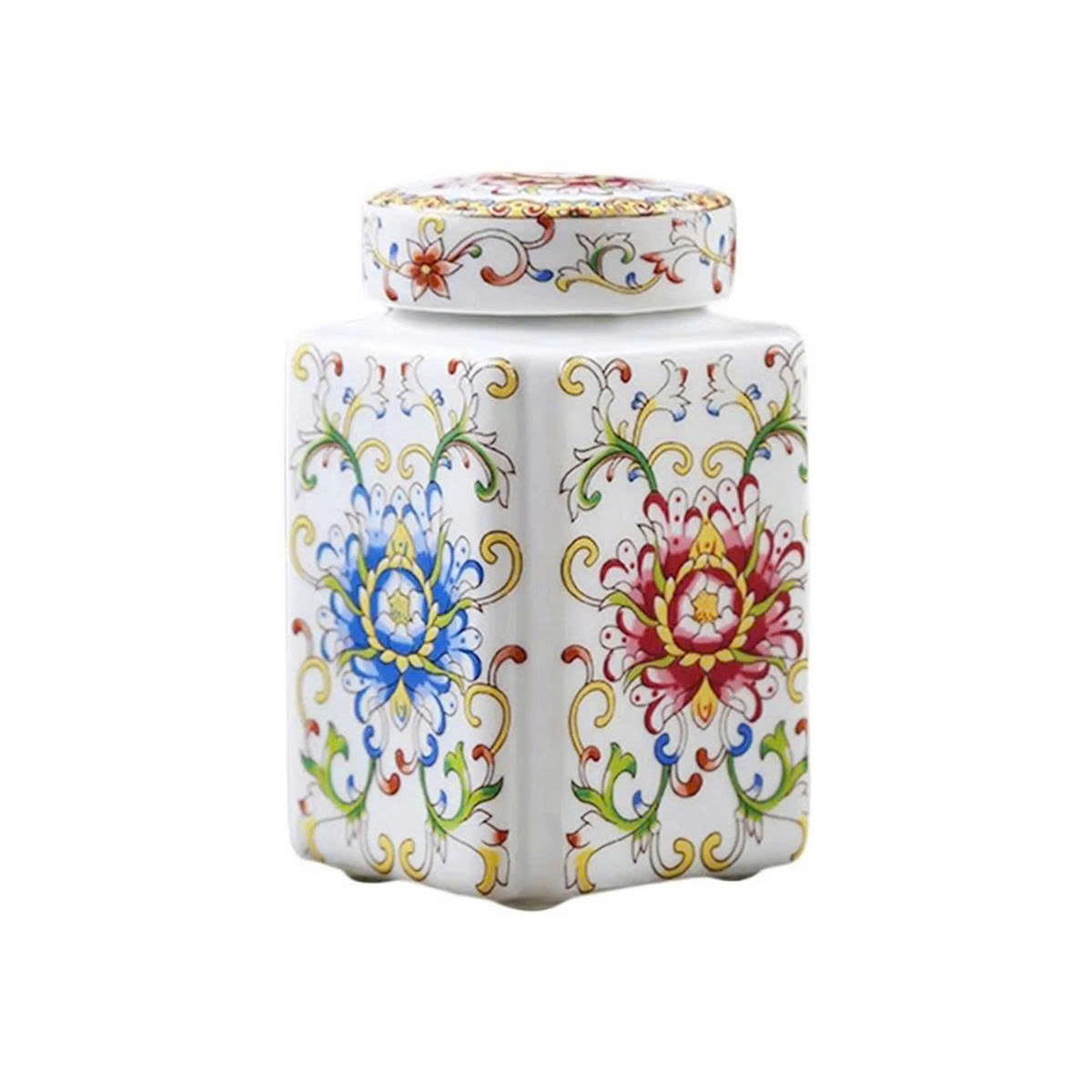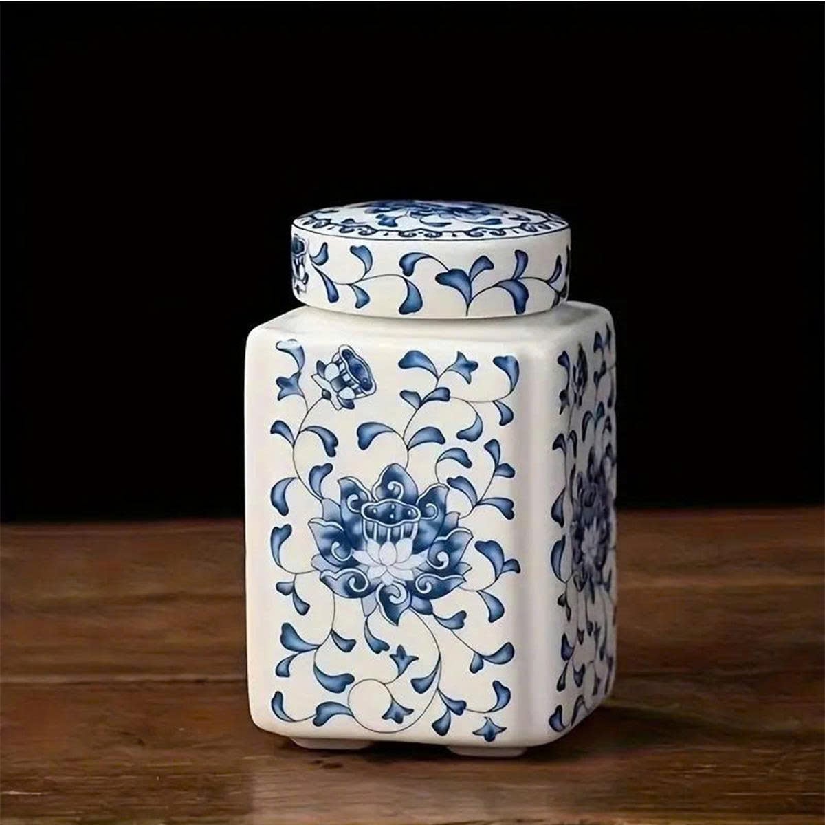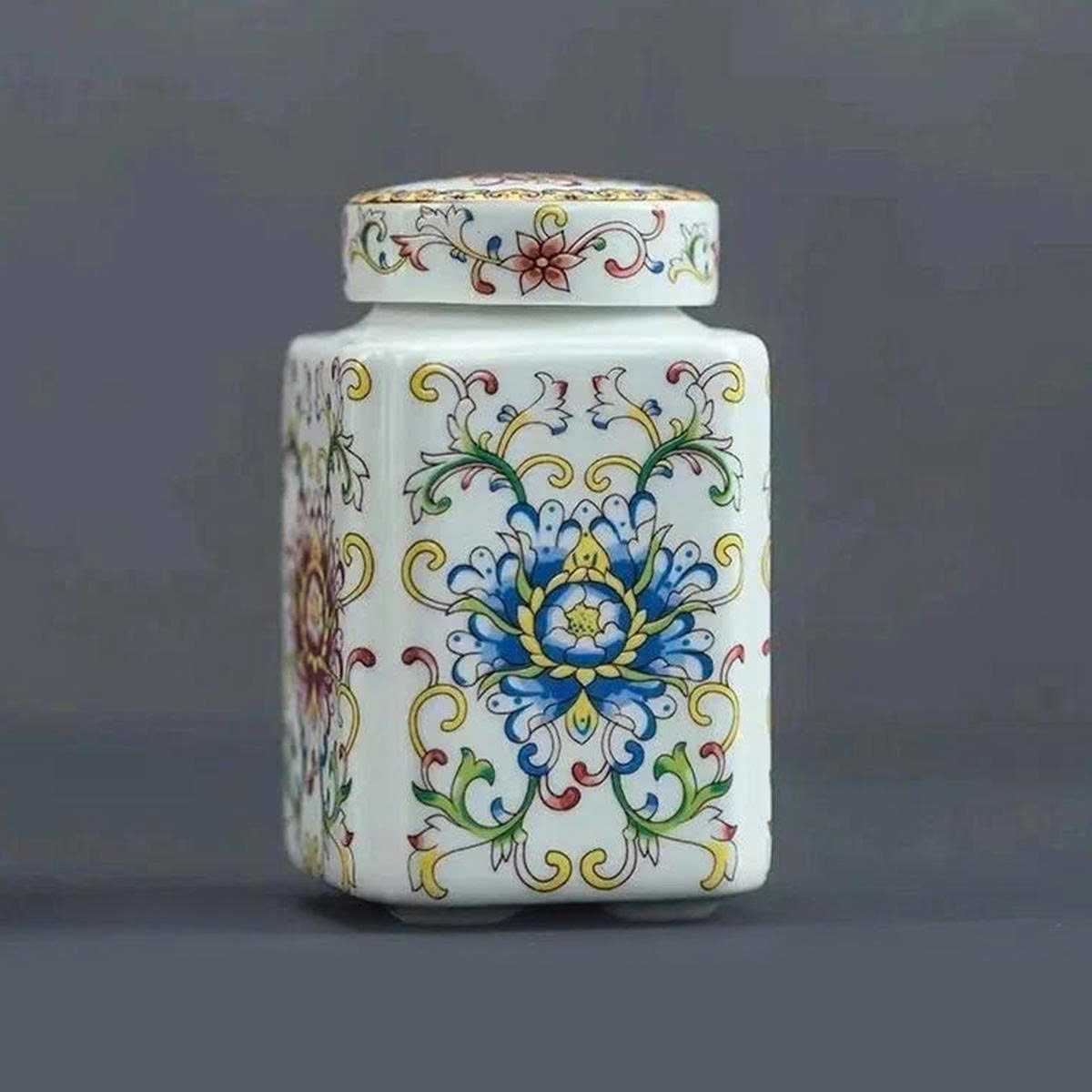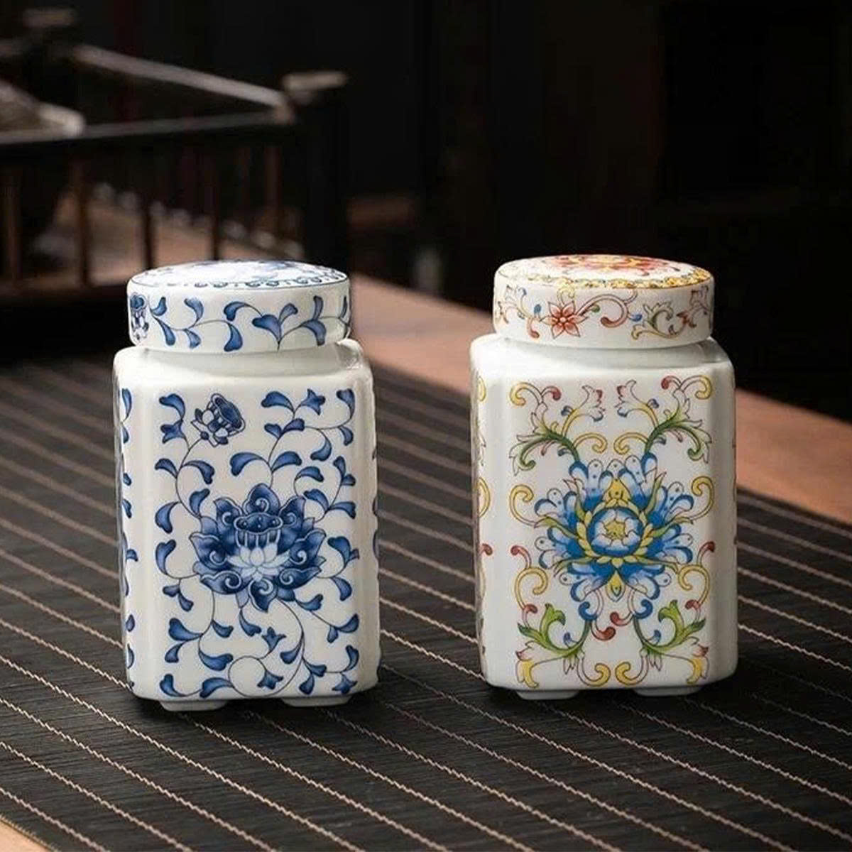 Hũ đựng trà sứ với hoa văn vẽ tay tinh xảo mang hơi thở của phong cách Á Đông thanh nhã – từng họa tiết xanh lam, vàng hoặc đa sắc đều gợi cảm giác bình yên, cổ điển và đầy chiều sâu.