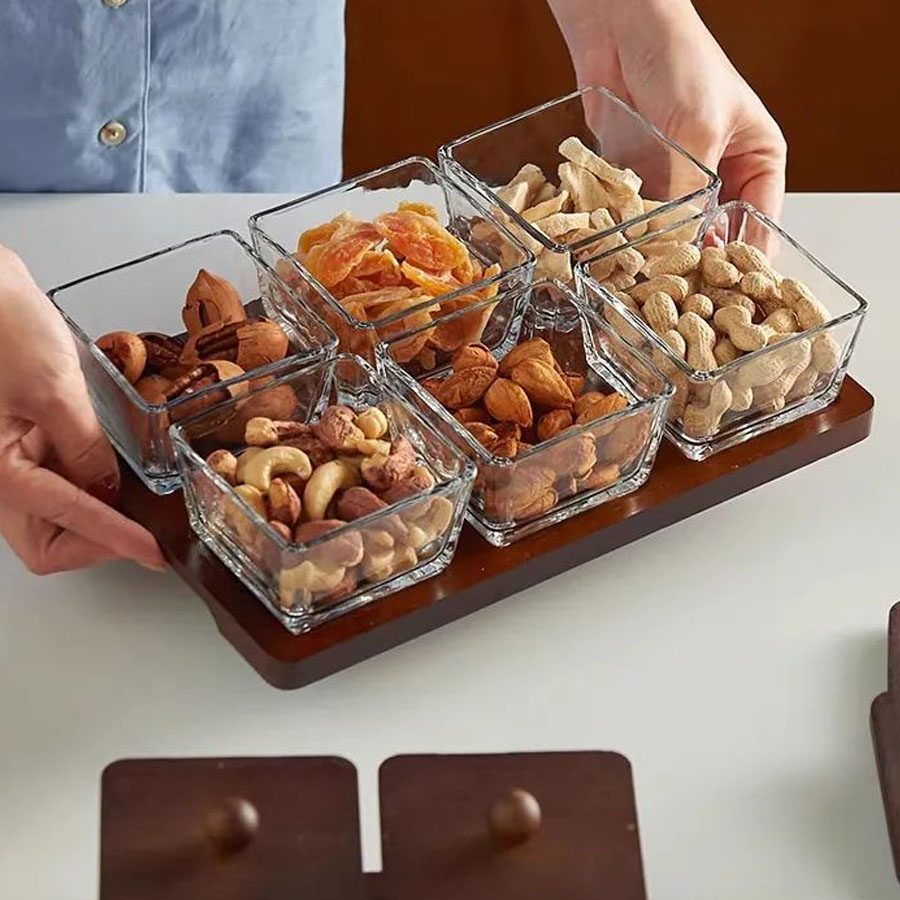 BỘ KHAY GỖ ĐỰNG SNACK 6 HŨ HÌNH VUÔNG