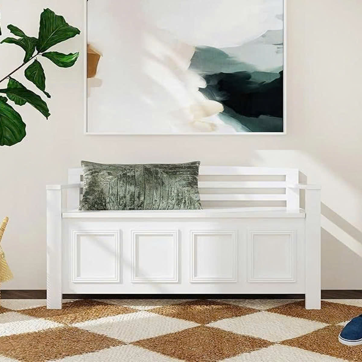 Ghế bench với tông trắng thanh lịch mang đến cảm giác nhẹ nhàng và tinh tế, dễ dàng hòa quyện vào mọi không gian sống, từ sảnh vào nhà đến góc thay giày ấm cúng.