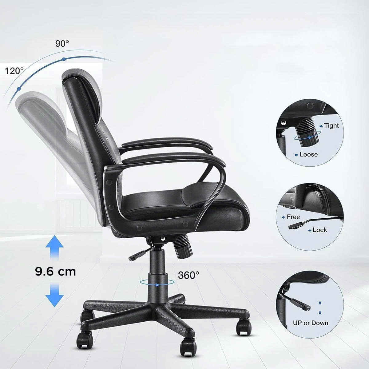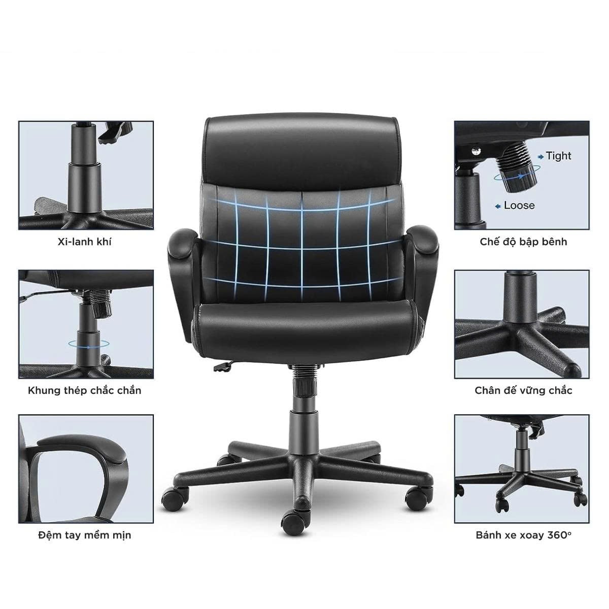 Chất liệu: Da PU + Điều chỉnh chiều cao ghế khí nén, Xoay 360 độ, ngả thư giãn bằng cần gạt + Bánh xe lăn trơn